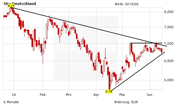 DER AKTIONÄR ist für die weitere Entwicklung bei der Sky-Deutschland-Aktie optimistisch. Die Übernahmehoffnungen dürften Kurs schon bald über die wichtige 7-Euro-Marke heben. Investierte Anleger bleiben dabei und sichern ihre Position mit einem Stopp bei 5,40 Euro ab.