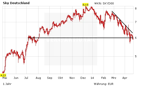 DER AKTIONÄR erwartet ein starkes zweites Halbjahr bei Sky. 2013 verzeichnete der Bezahlsender eine Abonnentenzahl von über 3,6 Millionen. Ende 2014 dürfte der Bezahlsender wohl eine halbe Million Kunden mehr haben. Anleger sollten jedoch unbedingt den Stopp bei 5,40 Euro beachten. Mit dem Bruch der Unterstützung bei 6,00 Euro drohen weitere Kursverluste.