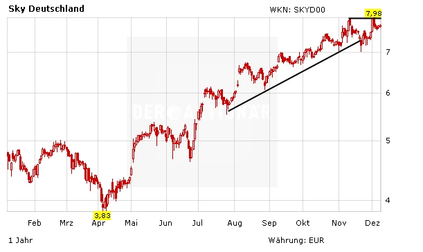 Was kaum einer für möglich gehalten hat, funktioniert also doch: Bezahlfernsehen in Deutschland. Sky ist auf den Weg in die schwarzen Zahlen offensichtlich nicht mehr aufzuhalten. Vor allem die Übertragungsrechte an der Fußball-Bundesliga erweisen sich für Sky als Glücksfall. Die Erfolgsgeschichte dürfte auch im laufenden Jahr weitergehen. Zweistellige Kurse sind durchaus zum Greifen nah.