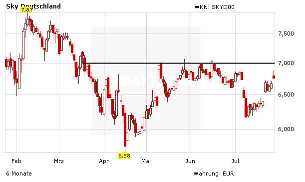 Die NordLB hat das Votum für Sky Deutschland ebenfalls auf „Kaufen“ belassen. Das Kursziel von Analyst Holger Fechner liegt sogar bei 9,00 Euro. Medienunternehmer Rupert Murdoch wolle nach langjährigen Spekulationen nun wohl doch seine Beteiligungen im Bezahlfernsehen neu ordnen. Das Angebot zu 6,75 Euro je Sky-Deutschland-Aktie entspreche lediglich dem gesetzlichen Mindestpreis. Die erfreuliche Geschäftsentwicklung des Unternehmens dürfte in den kommenden Jahren anhalten. Der Experte erwartet weitere Kurssteigerungen.
