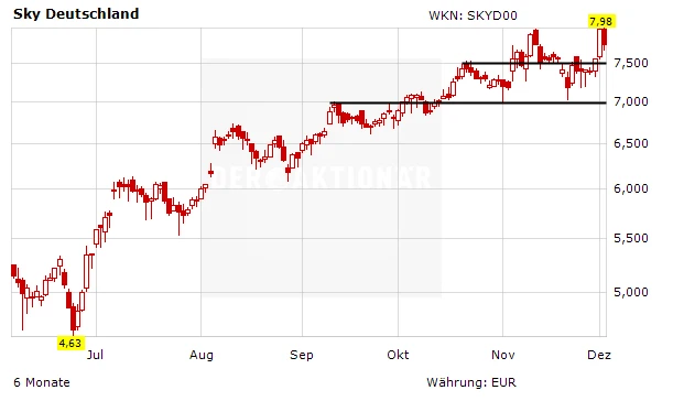 Sky Deutschland steht nach wie vor hoch in der Gunst der Analysten. Das Bankhaus Nomura hat das Kursziel für den Bezahlsender von 8,00 auf 8,50 Euro erhöht und seine Kaufempfehlung bekräftigt. Charttechnisch betrachtet steht bei Sky eine wichtige Entscheidung an.