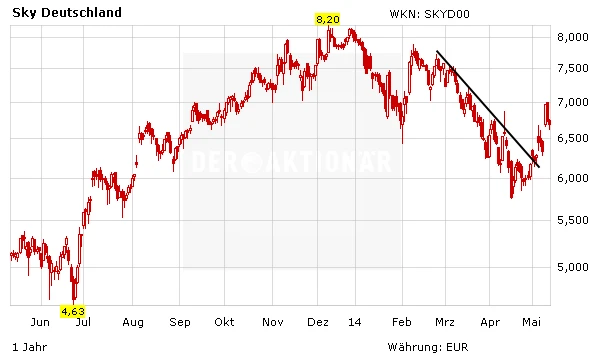 Mittlerweile haben die Experten der NordLB ihre Einschätzung nach der Übernahmemeldung überarbeitet. Analyst Holger Fechner bestätigte darin seine Kaufempfehlung für Sky Deutschland mit einem Kursziel von 9 Euro. Das Übernahmeangebot löst seiner Meinung zusätzliche Kursphantasie aus.