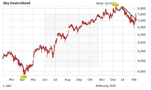Die Marktteilnehmer nehmen die Zahlen positiv auf. Nach schwächeren vorbörslichen Kursen, setzte sich die Sky-Aktie kurz nach Handelseröffnung an die Spitze des MDAX. Durch den Kurssprung ist die Aktie zudem über den kurzfristigen Abwärtstrend ausgebrochen. Investierte Anleger bleiben dabei. Alte Höchstkurse oberhalb von 8,00 Euro dürften nur eine Frage der Zeit sein.