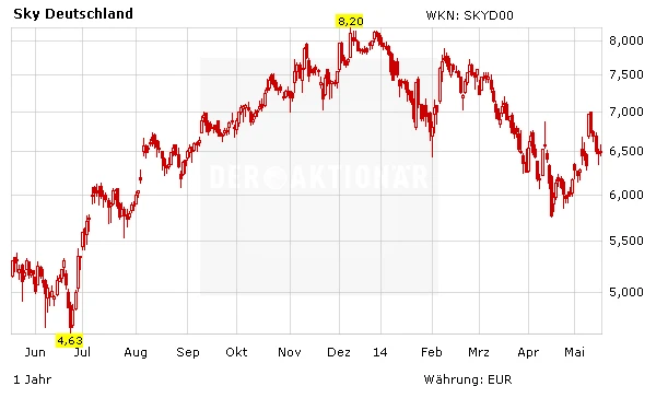 Sky Deutschland steht währenddessen selbst vor der Übernahme. Medienmogul Rupert Murdoch will seine Pay-TV-Geschäfte in Europa neue ordnen. Neben Sky Deutschland soll daher auch Sky Italia von BSkyB aufgekauft werden. Der britische Konzern muss bei einem Kauf von Sky Deutschland mindestens den gewichteten Durchschnittskurs der vergangenen drei Monate bezahlen. Dieser liegt nach dem Kursrückgang der vergangenen Wochen bei 6,73 Euro. Investierte Anleger bleiben weiter dabei und warten auf neue Details.