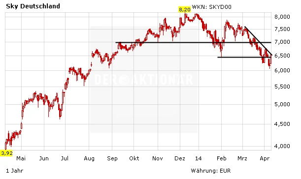 Nachdem sich die Aktie von Sky Deutschland zuletzt wochenlang eine Verschnaufpause gegönnt hatte, hat sich das Papier am Mittwoch eindrucksvoll zurückgemeldet. Mit einem Plus von 5,9 Prozent auf 6,53 Euro führte Sky die Gewinnerliste des MDAX unangefochten an. Mit der Rückeroberung der Marke von 6,50 Euro hat sich die charttechnische Situation weiter verbessert. Kurzfristig dürfte nun die 7-Euro-Marke in Angriff genommen werden. Der Sprung über den kurzfristigen Abwärtstrend würde ein zusätzliches positives Signal bedeuten. Anleger bleiben in jedem Fall mit einem Stopp bei 5,40 Euro weiter an Bord. Auch für einen Neueinstieg ist es noch nicht zu spät.