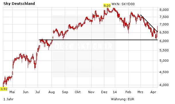 Mit der Rückeroberung der 6,50-Euro-Marke hat die Sky-Aktie zuletzt wieder ein Lebenszeichen von sich gegeben. Kurzfristig dürfte nun die 7-Euro-Marke in Angriff genommen werden. Anleger bleiben dabei. Das Kursziel des AKTIONÄR lautet weiterhin 10,00 Euro. Die optimistischen Töne auf der Hauptversammlung zum laufenden Jahr sollten für Unterstützung sorgen.