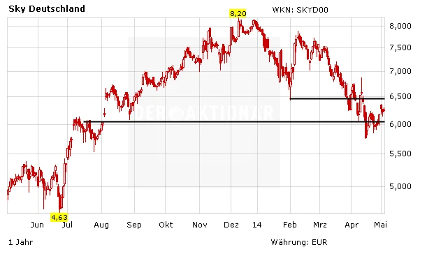 DER AKTIONÄR erwartet ein starkes zweites Halbjahr bei Sky. Die wichtige horizontale Unterstützungszone bei 6 Euro hat zuletzt gehalten. Investierte Anleger bleiben investiert. Gelingt der Ausbruch über 6,50 Euro, hellt sich die charttechnische Situation weiter auf.