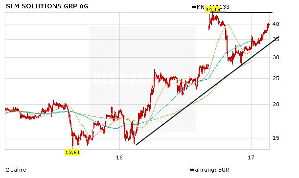 SLM Solutions ist an der Börse sportlich bewertet, keine Frage. Die Umsätze werden in den nächsten Jahren jedoch deutlich anziehen. Gratis dazu gibt es einen Schuss Übernahmefantasie. Die Aktie steht kurz davor, die psychologisch wichtige Marke von 40,00 Euro zu knacken. Nächste Etappenziel ist das Allzeithoch bei 44,30 Euro.
