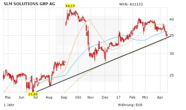 Der Automobilsektor befindet sich im Umbruch und die additive Fertigung könnte dabei aufgrund der neugewonnenen Designfreiheit eine Schlüsselrolle spielen. Die Umsätze werden in den nächsten Jahren deutlich anziehen. Gratis gibt es bei SLM Solutions nach wie vor einen Schuss Übernahmefantasie dazu. Rücksetzer wie aktuell in Richtung der 200-Tage-Linie bleiben Kaufchancen. Kursziel: 45 Euro.