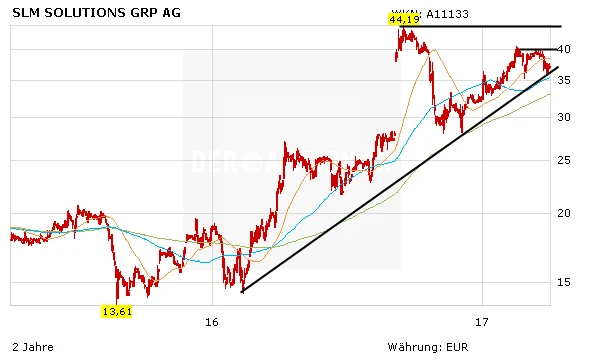 Es bleibt dabei: SLM Solutions ist an der Börse sportlich bewertet, keine Frage. Das Kurs-Umsatz-Verhältnis beträgt knackige 8,7. Dennoch: GE wird bei seinem Übernahmevorhaben im Oktober 2016 mit 38,00 Euro sicherlich keinen Mondpreis aufgerufen haben. Die Umsätze werden in den nächsten Jahren deutlich anziehen. Gratis dazu gibt es einen Schuss Übernahmefantasie. Rücksetzer bleiben Kaufchancen. Kursziel: 45 Euro.