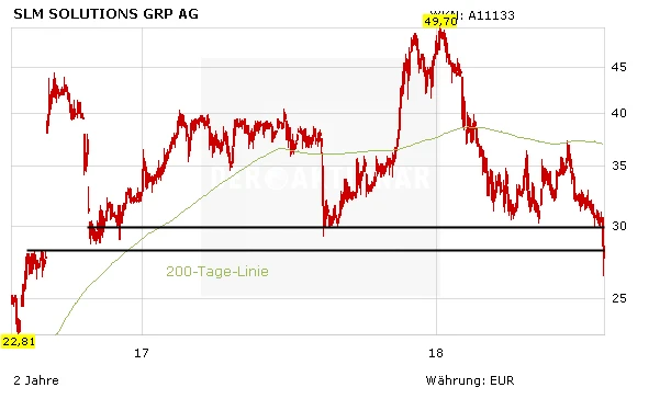 Im gestrigen Handel hat der TecDAX-Titel SLM Solutions mit dem Unterschreiten der breiten Unterstützungszone im Bereich von 30 Euro bereits ein massives Verkaufssignal ausgelöst. Nun beschleunigt sich die Talfahrt – Hauptgrund: Die Deutsche Bank stuft die Papiere ab und kassiert das Kursziel. Es ist an der Zeit, dass das Management liefert, zuletzt fehlte es am positiven Newsflow.
