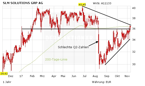 Mit den Zahlen zum dritten Quartal hat SLM Solutions die Schätzungen der Analysten leicht übertroffen. Dennoch wackelt die Jahresprognose weiter. Das Erreichen eines Umsatzes von 110 bis 120 Millionen Euro hängt maßgeblich vom Verlauf der formnext-Messe in Frankfurt am Main Mitte November ab. Den Kursabschlag nach den schlechten Halbjahreszahlen hat derweil die SLM-Solutions-Aktie wieder wettgemacht.
