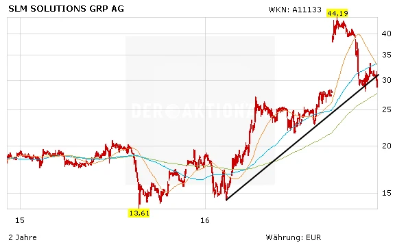 Die Aktien von SLM Solutions erwischt es nach einer Prognosesenkung am Freitag schwer: Die Papiere des Herstellers von 3D-Druckern rutschen um fast 10 Prozent auf 28,40 Euro ab. Damit deutet sich ein Test der 200-Tage-Linie an, die aktuell bei 27,66 Euro liegt.