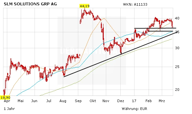 Es bleibt dabei: SLM Solutions ist an der Börse sportlich bewertet, keine Frage. Das Kurs-Umsatz-Verhältnis beträgt knackige 8,7. Dennoch: GE wird bei seinem Übernahmevorhaben im Oktober 2016 mit 38,00 Euro sicherlich keinen Mondpreis aufgerufen haben. Die Umsätze werden in den nächsten Jahren jedoch deutlich anziehen. Gratis dazu gibt es einen Schuss Übernahmefantasie dazu. Rücksetzer bleiben Kaufchancen.
