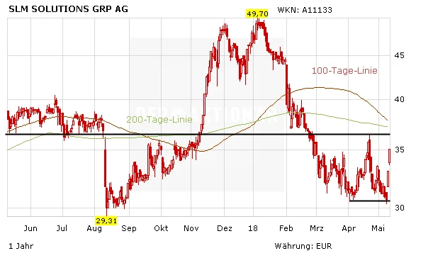 Dank der positiven Studie nähert sich die Aktie von SLM Solutions dem Verlaufshoch von April bei 36,40 Euro. Gelingt der Sprung über diese Marke, würde die Aktie ein starkes Kaufsignal generieren und im Anschluss Kurs in Richtung 200-Tage-Linie nehmen. Kann SLM Solutions im laufenden Jahr mit den in Aussicht gestellten Aufträgen aufwarten, hat die Aktie durchaus Luft nach oben. Wer investiert ist, bleibt an Bord und sichert die Position mit einem Stopp unterhalb der 30-Euro-Marke ab.