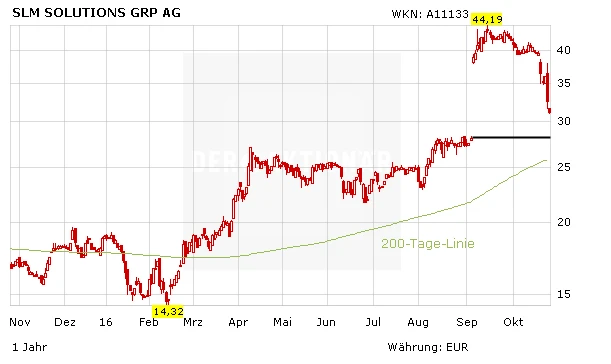 Wie bereits erwähnt (Link) lehnte der Hedgefonds Elliott unter der Leitung von Investor Paul Singer die Offerte ab. Singer hält über 20 Prozent an SLM Solutions und blockierte damit teilweise die Übernahme. Nachdem GE die Angebotsfrist nicht verlängert hat und auch keine Aufbesserung des Angebotes geplant ist, stürzt der TecDAX-Titel um rund elf Prozent ab. Gut möglich, dass die Aktie auf das Kursniveau vor der Veröffentlichung (Xetra-Schlusskurs von 27,80 Euro) zurück fällt.