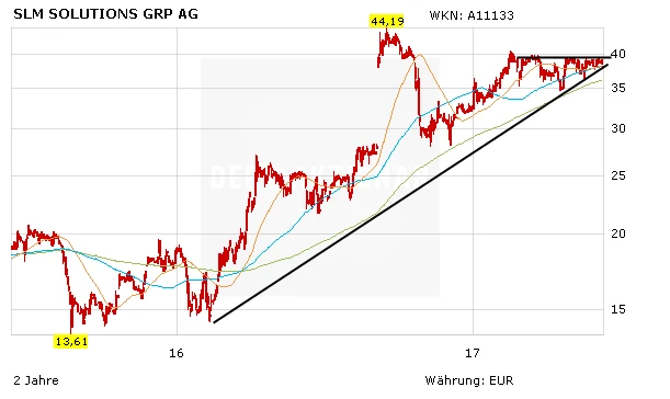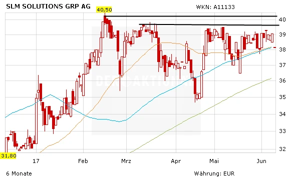 Es bleibt dabei: General Electric wird bei seinem Versuch im Oktober 2016 SLM Solutions zu schlucken mit 38,00 Euro pro Aktie sicherlich keinen Mondpreis aufgerufen haben. Dass SLM Solutions nicht billig ist, steht außer Frage: Ein Kurs-Umsatz-Verhältnis von knapp 9 ist sportlich – wann war an der Börse Qualität schon einmal günstig zu haben? Die charttechnische Ausgangslage der Aktie jedensfalls ist sehr spannend. Das Papier läuft seit mehreren Monaten seitwärts. Springt das Papier endlich wieder über die 40,00 Euro-Marke, sind Kurse um 45,00 Euro schnell möglich.