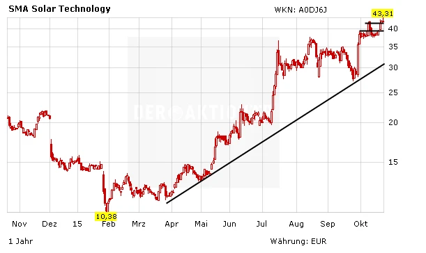 Bei SMA Solar läuft es derzeit rund. Die Geschäfte boomen - die Planzahlen wurden angehoben. Auch international startet SMA immer weiter durch. Letzte Woche wurde bekannt, dass das Unterehmen in Indien die Eine-Gigawatt-Marke geknackt hat. Es wurden also Wechselrichter mit einer Gesamtleistung von über einem Gigawatt verkauft. Das Chartbild könnte kaum besser sein. Seit Jahresbeginn legte das Papier 190 Prozent zu.