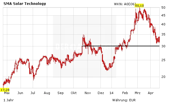 Dies sorgt auch für Verunsicherung bei SMA-Solar-Aktionären. Der Solar- und Wechselrichterhersteller hat selbst mit hohen Preisdruck und dem starken Nachfragerückgang in Europa – dort erzielte der Konzern 2013 mehr als 60 Prozent seines Umsatzes – zu kämpfen. Fällt die Aktie nach dem jüngsten Kursrutsch unter die horizontale Unterstützung bei 30 Euro, drohen weitere Verluste bis zur 25-Euro-Marke. Anleger bleiben weiterhin an der Seitenlinie.