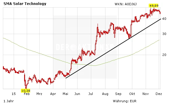 Die Anleger reagierten trotz der positiven Nachricht mit Kursabschlägen. In der letzten Woche büßte die Aktie acht Prozent ein. Das Dreijahreshoch bei 49,89 Euro ist wieder etwas weiter entfernt. Anleger sollten jedoch nicht in Panik verfallen. Seit Jahresbeginn notiert das Papier 190 Prozent im Plus. Investierte Anleger bleiben dabei und lassen die Gewinne laufen. Das aktuelle Niveau kann auch zum Aufbau von neuen Positionen genutzt werden. Die Aktie ist mit einem 2016er-KGV von 17 aufgrund starker Wachstumsraten nicht zu teuer.