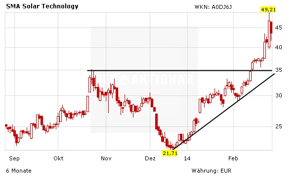 Die Papiere von SMA Solar machten zuletzt durch die Partnerschaft mit dem Danfoss-Konzern Schlagzeilen. Die Dänen steigen mit einem Anteil von 20 Prozent in den deutschen Solar-Wechselrichter ein. Der Kaufpreis beträgt 43,57 Euro pro Aktie.