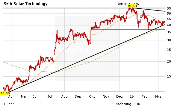 Strom aus erneuerbaren Quellen ist dringend notwendig und mittlerweile auch konkurrenzfähig – auch ohne staatliche Hilfen. Das würdigen die Anleger auch, was sich an den steigenden Notierungen entsprechender Aktien ablesen lässt. Grundsätzlich muss der Aktienkurs von SMA Solar Technology nun jedoch die 38-Tage-Linie bei derzeit 43,40 Euro überwinden, um sich weiteres Potenzial zu eröffnen.