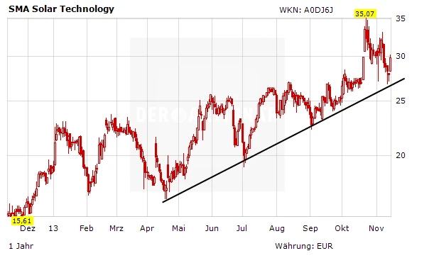 Am Donnerstag schwappt die positive Stimmung auch nach Deutschland über. Im Handelsverlauf notiert die Aktie von SMA Solar nahezu fünf Prozent im Plus. Ebenfalls positiv: Zuletzt ging Japans größtes Photovoltaikkraftwerk (70 Megawatt) an das Netz. Die Systemtechnik dafür lieferte SMA Solar. Mit dem Kurssprung dürfte auch die jüngste Konsolidierung beendet sein. Gelingt der Sprung über die 32-Euro-Marke, rückt als nächstes das alte Jahreshoch in den Fokus.