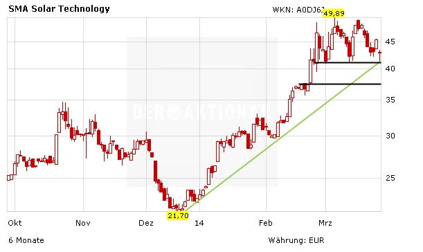 Nicht nur im operativen Geschäft, auch was die Charttechnik betrifft, hakt es bei SMA. Der im Dezember 2013 begonnene Aufwärtstrend ist im Tagesverlauf gebrochen worden. Erst der starke Schlussspurt trieb die Aktie wieder über die wichtige Marke von 42 Euro. Kann das Niveau nicht gehalten werden, ist ein Test des letzten Ausbruchsniveaus bei 38 Euro wahrscheinlich.