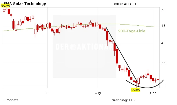 Trotz der schlechten Branchen-Aussichten konnte die SMA-Solar-Aktie die Talfahrt stoppen und einen Boden im Bereich von 31 Euro bilden. Die Papiere sind weiterhin stark überverkauft – eine Gegenreaktion in den kommenden Tagen ist wahrscheinlich. Zudem ist der Titel mit einem KGV von derzeit 16 für das Jahr 2017 günstig bewertet. Trotzdem sollten Anleger vorerst klare Kaufsignale abwarten.