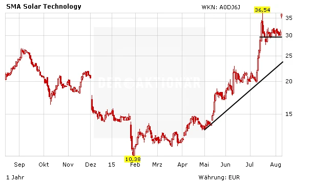 Die überraschend guten Zahlen haben auch die Deutsche Bank positiv gestimmt. Analyst Alexander Karnick hat das Kurziel für SMA Solar um über 20 Prozent von 30 auf 37 Euro erhöht. Die Einstufung lautet weiterhin „Buy“. Dank der starken Impulse steht die Aktie inzwischen unmittelbar unterhalb des Jahreshochs bei 36,40 Euro. Gelingt der Sprung über diese Marke, sind weiterhin ansteigende Kurse denkbar. Auf dem aktuellen Niveau ist eine Fortsetzung der Rallye durchaus möglich.