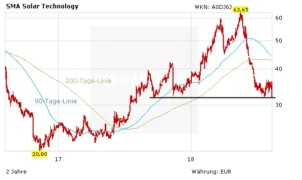 Die SMA-Aktie stürzt nach diesen Aussagen an der Börse ab. Am Vormittag notiert der TecDAX-Wert zeitweise gut 13 Prozent unter Vortag bei 30,80 Euro - der tiefste Stand seit Ende Juli 2017. Ein nachhaltiges Unterschreiten der Unterstützungszone bei gut 31 Euro dürfte weitere Kursverluste nach sich ziehen.