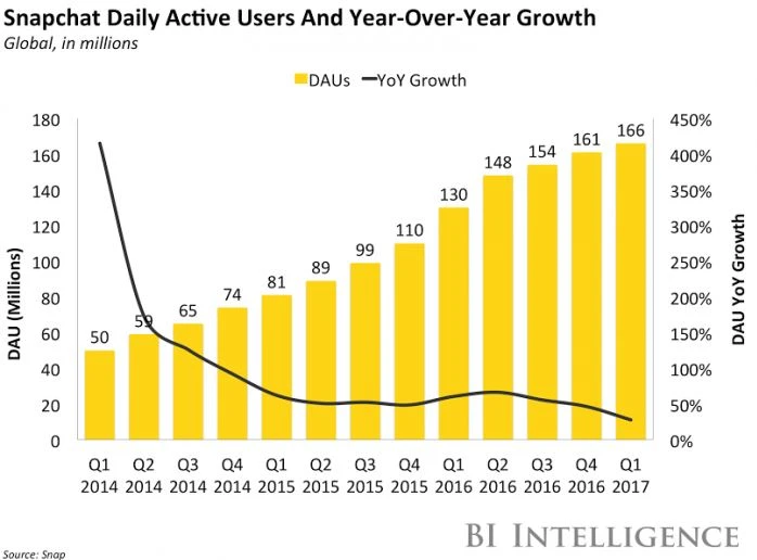 Und tatsächlich sind die Zahlen schwach: Ende des ersten Quartals 2017 verwendeten täglich 166 Millionen Menschen die App Snapchat. Wie die Grafik unten zeigt, war das Nutzerwachstum aber auf einem historischen Tiefstand. Der Grund hierfür ist schnell gefunden: Instagram, die Foto-App von Facebook. Die populäre App (über 400 Millionen täglich aktive Nutzer) kopierte kurzerhand wichtige Snapchat-Features und gewinnt schneller Nutzer hinzu als Snapchat.