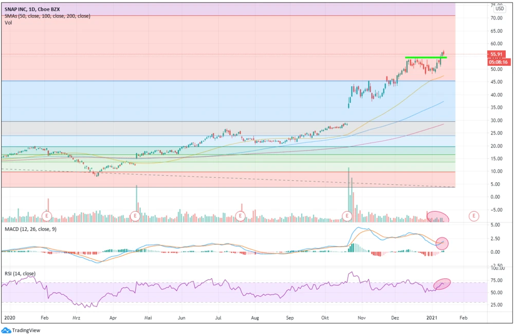 Nachdem die Snap-Aktie Mitte Dezember ein neues Allzeithoch bei 54,71 Dollar markiert hatte, korrigierte sie bis knapp über die Unterstützungslinie bei 47,27 Dollar (DER AKTIONÄR warnte). An dieser Marke kam es dann am 6. Januar zu einem kräftigen Rebound. Der Wert legte von dort aus rund 20 Prozent zu und erreicht heute bei Börsenstart ein neues Rekordhoch bei 57,39 Dollar.