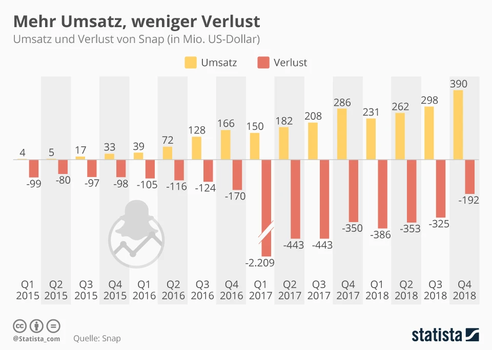 Die Rallye der Aktie liegt insbesondere in der fundamentalen Entwicklung des Konzerns. Der Entwickler der Social-Media-App Snap hat im vierten Quartal die Erwartungen der Analysten übertroffen: Der Verlust pro Aktie war mit 0,04 Dollar deutlich niedriger als die Erwartungen von 0,07 Dollar und der Umsatz verbesserte sich auf 390 Millionen Dollar. Damit führt Snap einen eindeutigen Trend fort.
