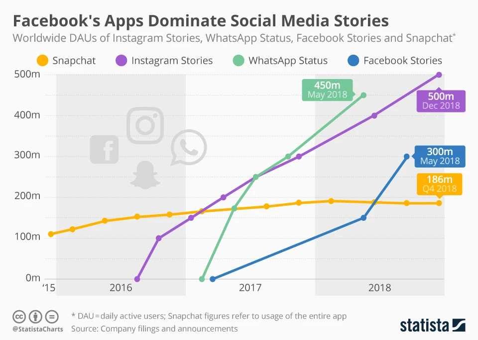 Der eigentliche Konkurrent für Snap ist aber nicht Twitter sondern Facebook. Der Social-Media-Gigant hat 2,3 Milliarden aktive Nutzer. Zum Vergleich: Snap kommt gerade einmal auf 186 Millionen. Und Facebook kopiert erfolgreich die Funktionen von Snapchat auf allen seinen Plattformen. Während das Wachstum der geteilten Storys auf Instagram, WhatsApp und Facebook überzeugt, bleibt die Zahl bei Snap nahezu konstant. Doch besonderes in den Storys lässt sich mit geschalteter Werbung viel Umsatz generieren.