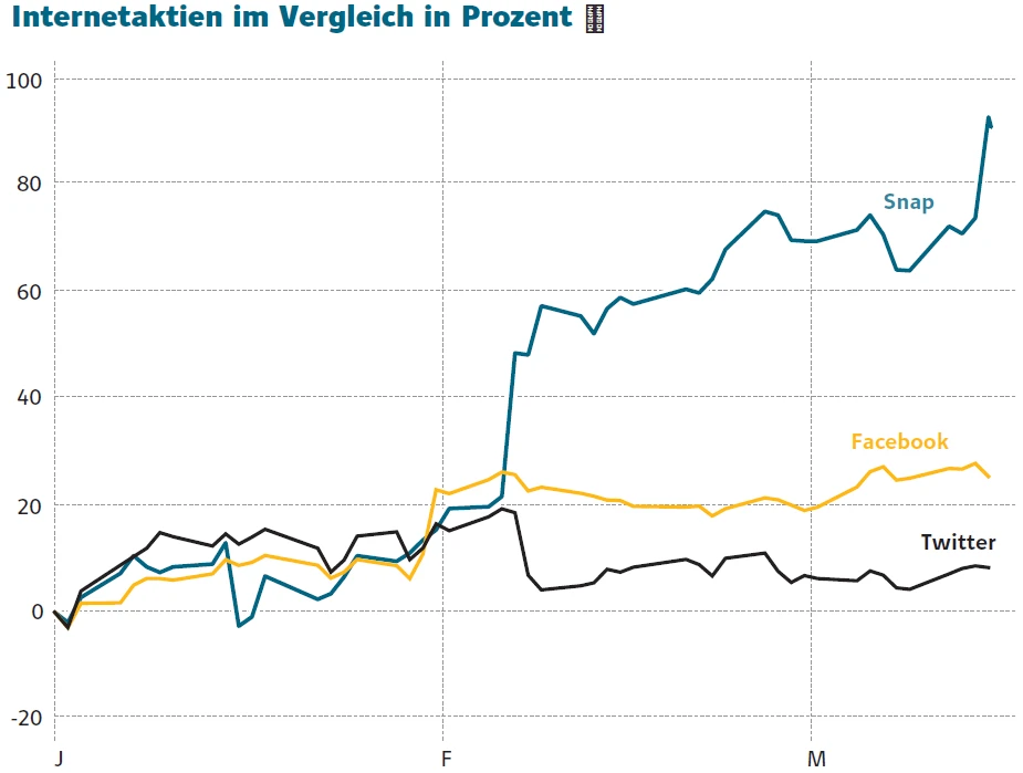 Nach einem positiven Analystenkommentar geht die Aktie der Social-Media-Plattform Snapchat durch die Decke. Mehr als elf Prozent ist sie alleine heute im Plus. Seit Jahresanfang hat sich die Aktie fast verdoppelt. Die Zahlen für das vierte Quartal 2018 waren deutlich weniger miserabel als angenommen. Ein Vergleich mit Twitter und Facebook liegt auf der Hand.