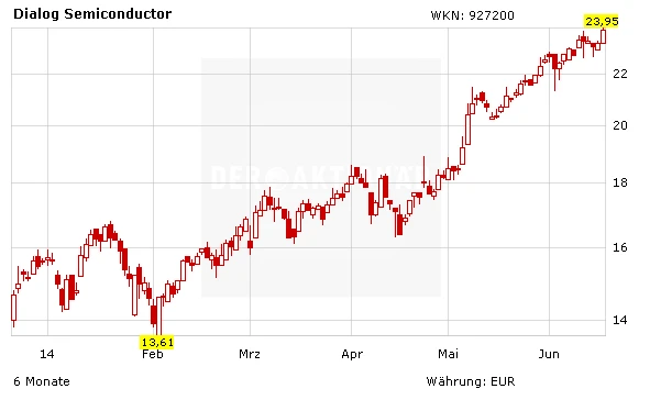 Die Papiere des Chipherstellers Dialog Semiconductor zählen am Dienstag zu den stärksten Werten im TecDAX. Der Höhenflug der Aktie hält bereits seit Wochen an. Ein Ende des Aufwärtstrends ist noch lange nicht in Sicht. Für zusätzliche Fantasie sorgen Meldungen zur iWatch von Apple. Die Halbleiterbranche boomt und profitiert vom Trend hin zu immer mehr mobilen Endgeräten. Für das laufende Jahr kündigte Dialog-Semiconductor-Vorstand Jalal Bagherli zum achten Mal in Folge steigende Umsätze an. Investierte Anleger bleiben dabei.
