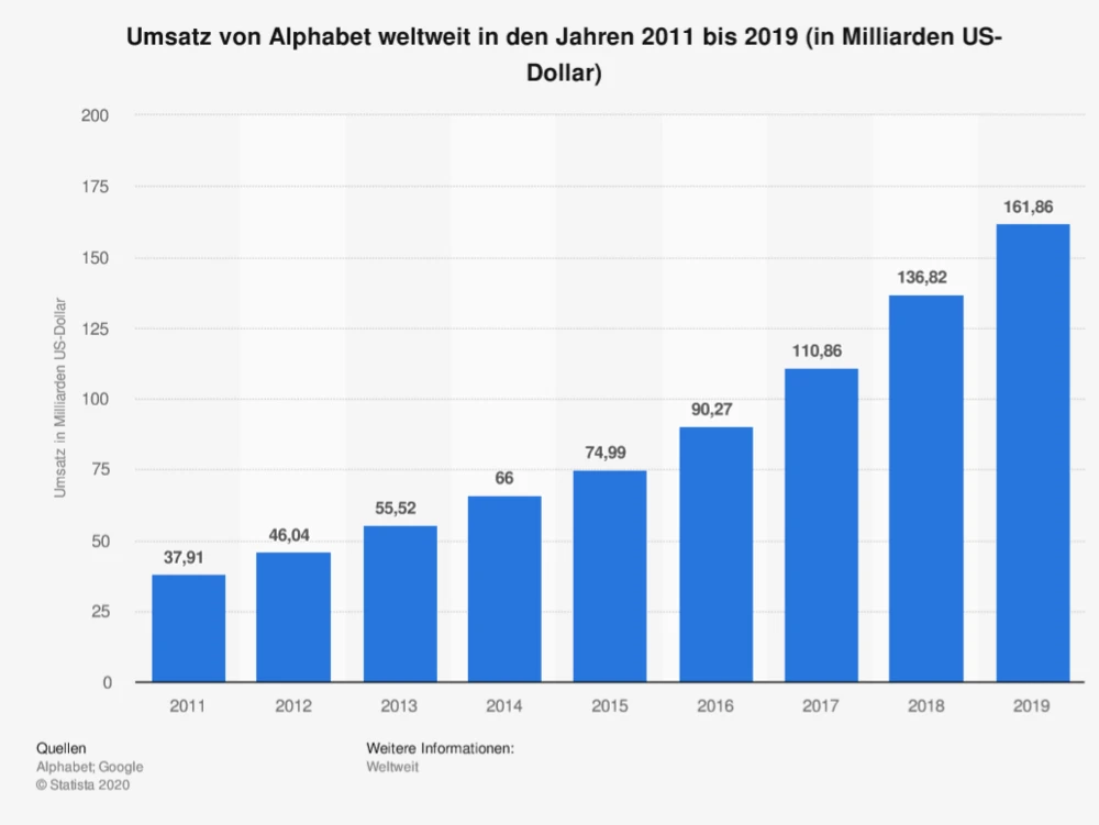 Wie die Grafik zeigt, erzielt Alphabet seit Jahren zweistellige Umsatzwachstumsraten. Diese Story dürfte sich auch in diesem Jahr fortsetzen, schließlich spielt die Corona-Pandemie dem Konzern tendenziell in Karten.