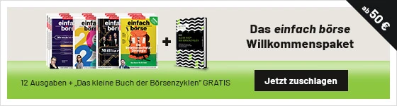 Mit dem Willkommenspaket von einfach börse können Sie sich jetzt 12 Ausgaben als E-Paper und das Buchgeschenk „Das kleine Buch der Börsenzyklen“ von Jeffrey A. Hirsch sichern. Lassen Sie sich auch in weniger bequemen Zeiten nicht wegen möglicher Risiken von einem Aktieninvestment abschrecken – die Börse bietet auch während stürmischer Phasen die Möglichkeit zum Vermögensaufbau.