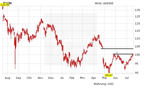 Noch kämpft die Apple-Aktie mit der 100-Dollar-Marke. Fällt diese, liegt das nächste Kursziel bei 105 Dollar. Dann wäre die Kurslücke geschlossen. Spekulativ orientierte Anleger steigen ein, haben aber die Veröffentlichung der Quartalszahlen am kommenden Dienstag nach US-Börsenschluss im Hinterkopf.