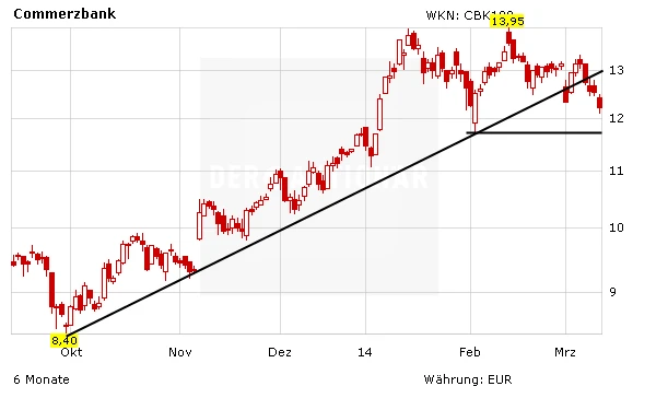 Die Commerzbank-Aktie hatte am Dienstag auf Schlusskursbasis ein neues Zwischentief markiert und damit neue Sorgenfalten auf die Stirn der Aktionäre getrieben. Es drohte heute ein Rücksetzer auf das Intraday-Tief vom 4. Februar bei 11,72 Euro. Aufgrund der Hochstufung besteht aber jetzt die Möglichkeit, dass die Aktie ihren seit Jahresbegin gültigen Seitwärtstrend fortsetzt und wieder in Richtung 13 Euro dreht.