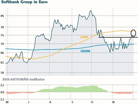 Die Softbank-Aktie konnte in den vergangenen Tagen die Unterstützung bei 73,02 Euro knacken und steht nun bei 74,00 Euro etwa 2 Prozent unter der 90-Tage-Linie. Sollte das IPO zum Erfolg werden, dürfte es zu einem Break kommen.