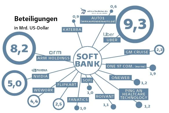 Die gerade einmal vier Geschäftsbereiche – Mobilfunk, Internet, Robotik, Energie – täuschen darüber hinweg, dass sich unter dem Dach der Holding (seit 1999) mittlerweile mehr als 1.000 Tochtergesellschaften tummeln, darunter der amerikanische Mobilfunker Sprint (83 Prozent Anteil), Yahoo Japan (48 Prozent) und Alibaba (29 Prozent). Über seinen Vision Fund – ein mit 100 Milliarden Dollar ausgestatteter Beteiligungsfonds – hält Softbank unter anderem Anteile an Shootingstars wie Uber (9 Milliarden Dollar, siehe Grafik) und Didi, dem chinesischen Uber-Klon. Daneben finden sich klangvolle Namen wie Nvidia und ARM in dem Portfolio. Sons bislang mit Abstand erfolgreichster Coup: Im Jahr 2000 investierte er 20 Millionen Dollar in das unbekannte chinesische Start-up Alibaba. Das Aktienpaket ist zu aktuellen Kursen rund 120 Milliarden Dollar wert – ein Versechshundertfacher!
