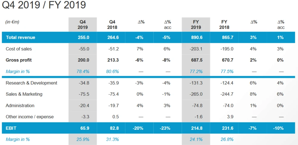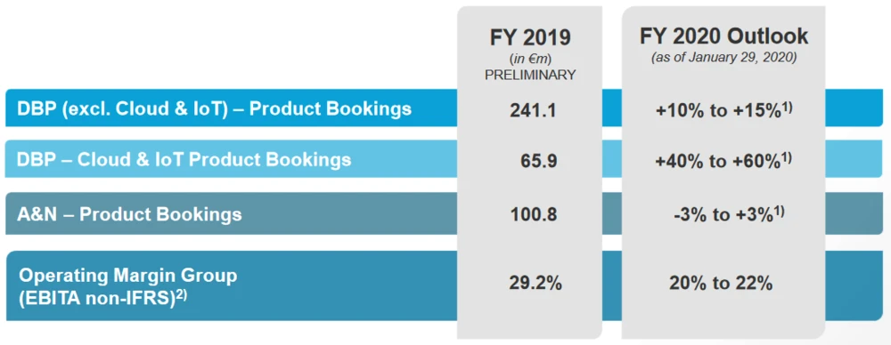 Im Gesamtjahr 2019 konnte das strategisch wichtige Wachstumsfeld rund um Cloud und IoT immerhin um 39 Prozent zulegen, der CEO Sanjay Brahmawar hatte aber mindestens 75 Prozent anvisiert. Insgesamt konnte der Umsatz im abgeschlossenen Geschäftsjahr um drei Prozent auf circa 891 Millionen Euro gesteigert werden (wobei ein Teil des Umsatzanstiegs auf Währungseffekte zurückzuführen ist). Das EBITDA und der Nettogewinn gingen um fünf Prozent auf circa 260 Millionen Euro beziehungsweise um vier Prozent auf 188 Millionen Euro zurück.
