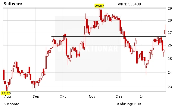 Mit dem Kurssprung über den Widerstand bei 26,70 Euro hat sich die charttechnische Situation aufgehellt. Aus charttechnischer Sicht ist nun Luft zum Zwischenhoch bei 29,07 Euro. Investierte Anleger bleiben dabei und lassen die Gewinne laufen.