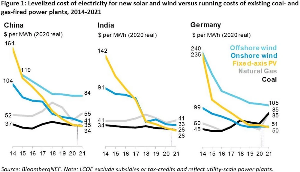 JinkoSolar rechnet mit „signifikanten Steigerungen des Absatzes in den nächsten Jahren.“ Eine neue Grafik von Bloomberg zeigt wieso: Zwar sind etwa in Europa im ersten Halbjahr Corona-bedingt die Modulpreise wieder um rund fünf Prozent gestiegen, doch unterm Strich sind die Kosten in den letzten Jahren so tief gefallen, dass neue Solarprojekte selbst abgeschriebene Kohlekraftwerke unterbieten können.