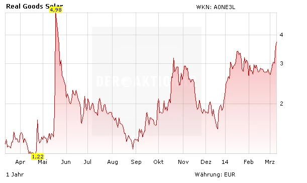 In Deutschland ist RGS Energy oftmals noch unter dem alten Namen Real Goods Solar zu finden. Die Aktie wird unter der WKN A0N E3L an den Börsen in Frankfurt, Stuttgart, Berlin und München gehandelt und notiert derzeit bei 3,75 Euro. Das Kursziel liegt bei 8,00 Euro. Zur Absicherung sollte bei 2,60 Euro ein Stopp platziert werden.