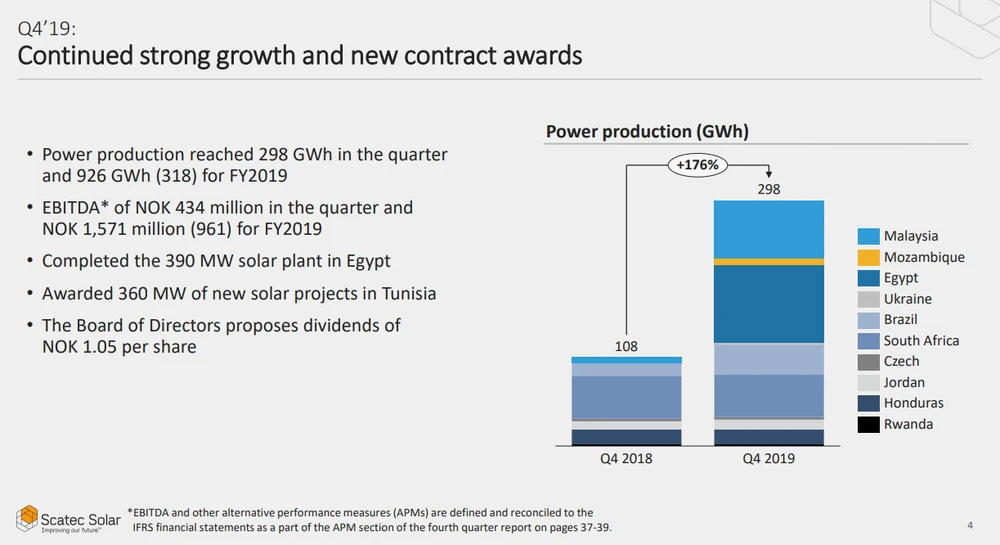 Die Norweger konnten die Stromproduktion im Vergleich zum Vorjahreszeitraum um satte 176 Prozent nach oben schrauben. Im Gesamtjahr 2019 verdoppelte Scatec Solar die installierte Kapazität auf 1,2 Gigawatt.