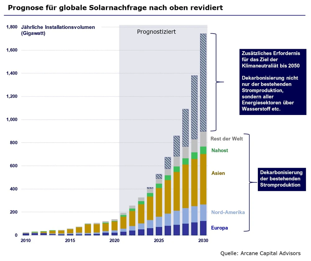Jetzt hat die Fondsgesellschaft einen neuen, noch einmal verbesserten Ausblick auf die Jahre bis 2030 und darüber hinaus gegeben: „Bis 2045 sehen wir bei der global installierten Solarstromleistung das Potenzial für eine Verhundertfachung.“ Annahme dafür: Dank Elektroauto und Co werde sich die Stromnachfrage etwa verdreifachen. Dies erfordere den Umstieg von fossilen Brennstoffen auf Wasserstoff und synthetische Brennstoffe. Die dafür nötige, skalierbare und kosteneffiziente Stromproduktion käme dabei nur aus Solar– und Windenergie.