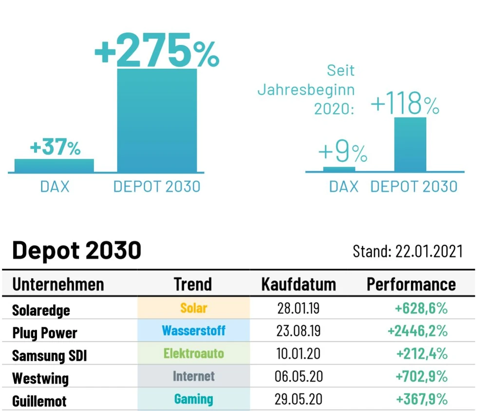 Wir haben im grünen Depot 2030 des AKTIONÄR Hot Stock Report dank Titel wie Solaredge (+600 Pozent), Plug Power und SMA Solar im Jahr 2020 rund 100 Prozent Gewinn erzielt. Auch 2021 setzen wir auf die Energie-Revolution. Einfach hier freischalten und ab sofort alle Transaktionen frühzeitig per SMA und Mail erhalten.
